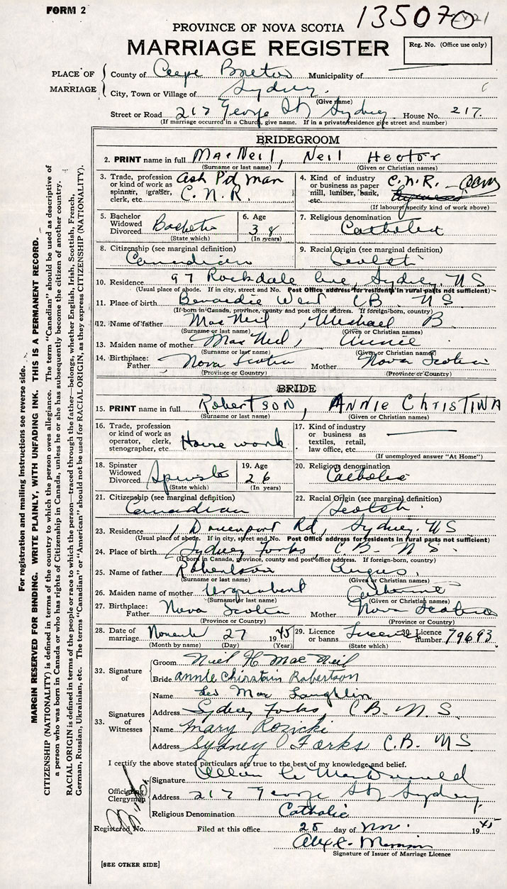 26. Place of marriage 217 George Street, Sydney Sydney, Cape Breton County