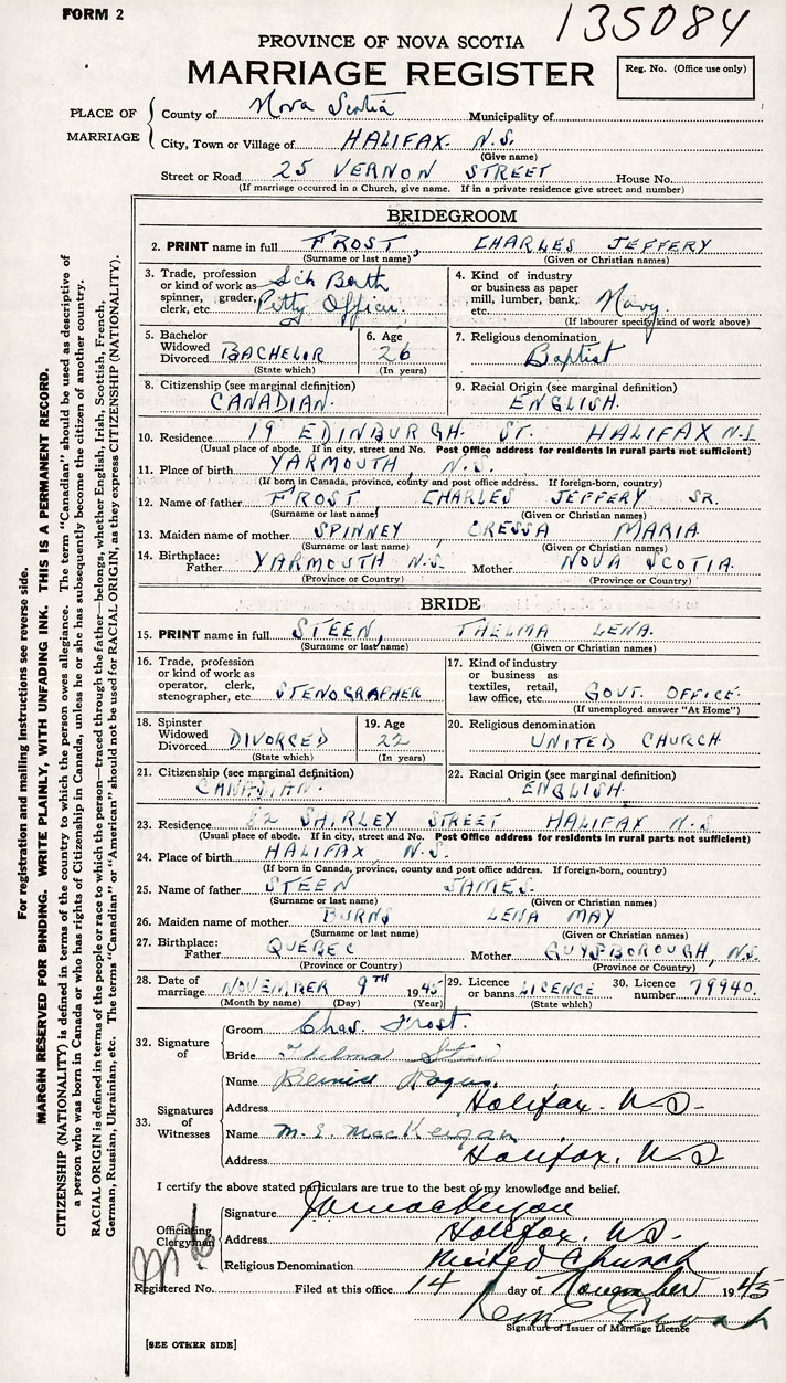26. Place of marriage 25 Vernon St Halifax , Halifax County