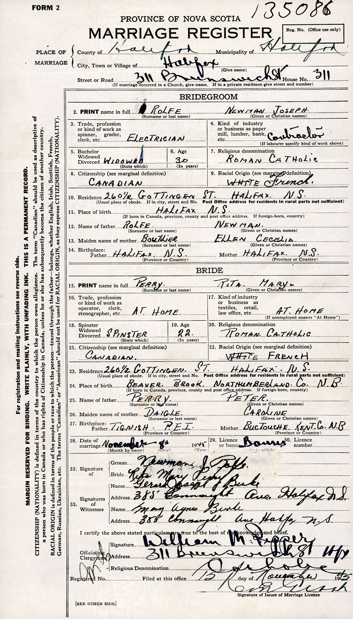 26. Place of marriage 311 Brunswick St Halifax, Halifax County