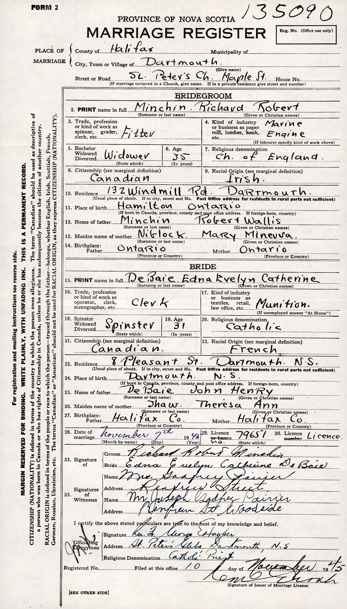 PLACE OF MARRIAGE County of Halifax in City or Town Dartmouth