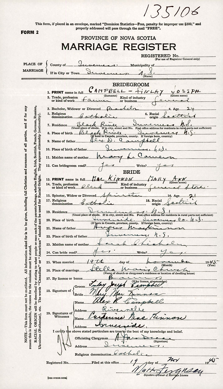 26. Place of marriage Stella Maris Church, 47 Upper Railway St. Inverness, Inverness County