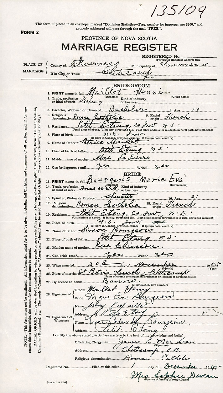 PLACE OF MARRIAGE County of Inverness in City or Town Cheticamp