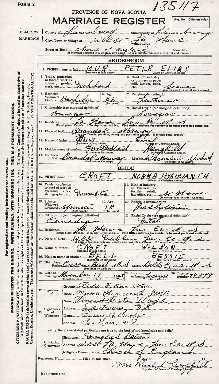 PLACE OF MARRIAGE County of Lunenburg in City or Town West La Have