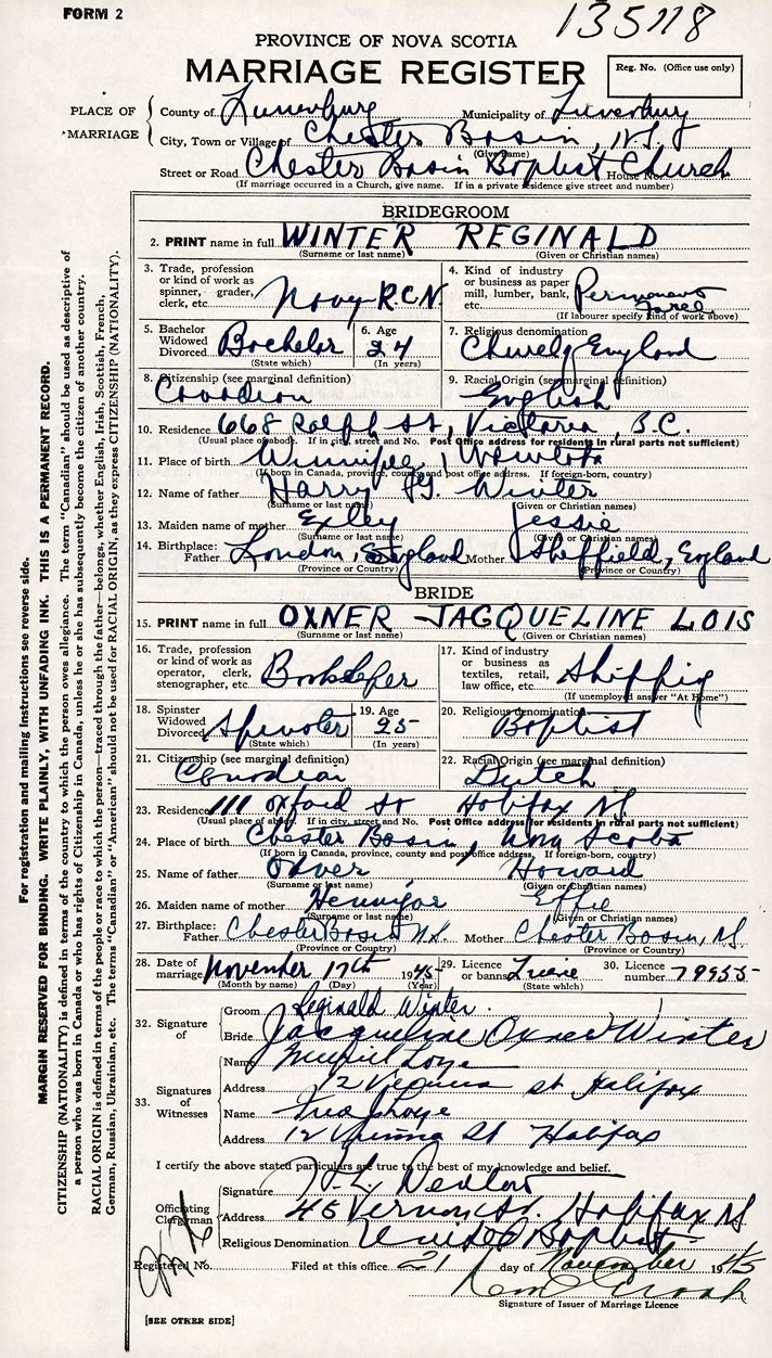 26. Place of marriage Chester Basin Baptist Church Chester Basin, Lunenburg County