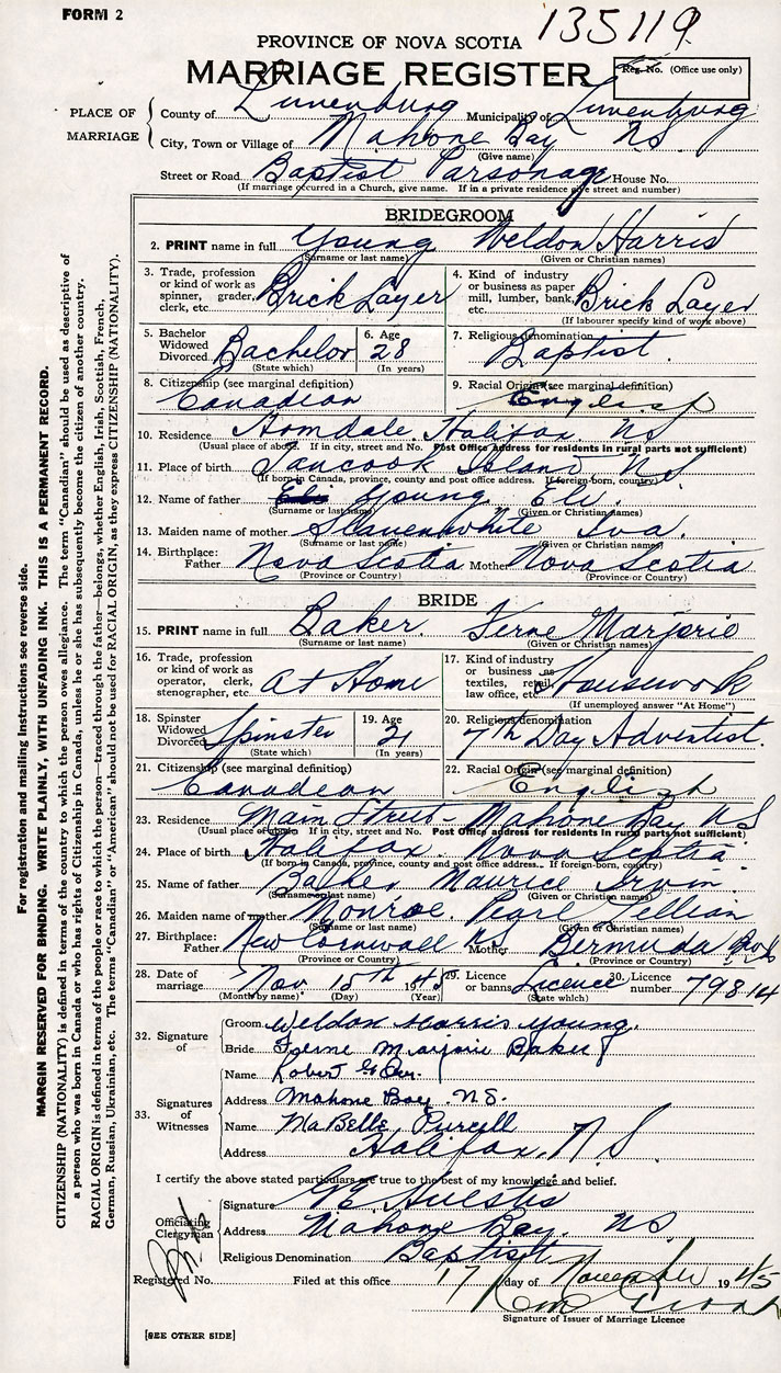 PLACE OF MARRIAGE County of Lunenburg in City or Town Mahone Bary