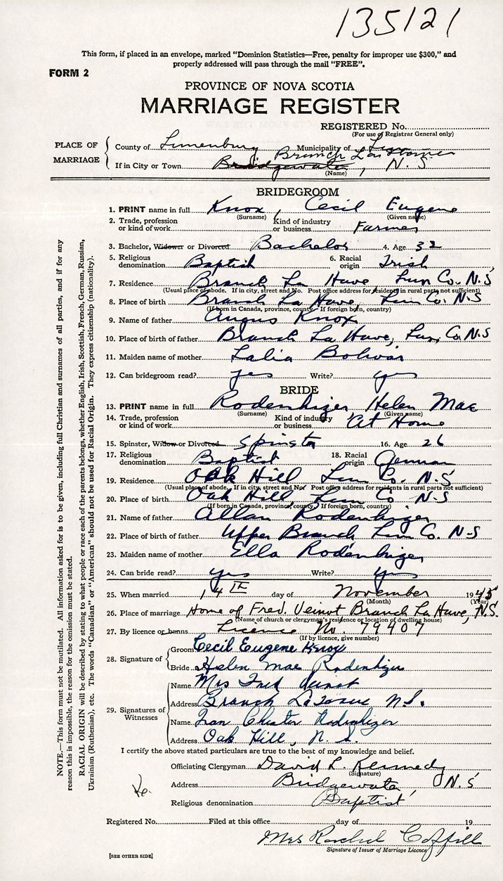 PLACE OF MARRIAGE County of Lunenburg in City or Town Branch LaHave