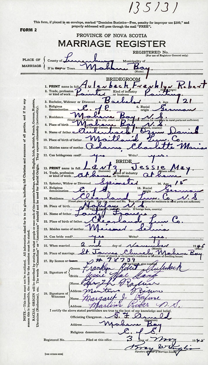 PLACE OF MARRIAGE County of Lunenburg in City or Town Mahone Bay