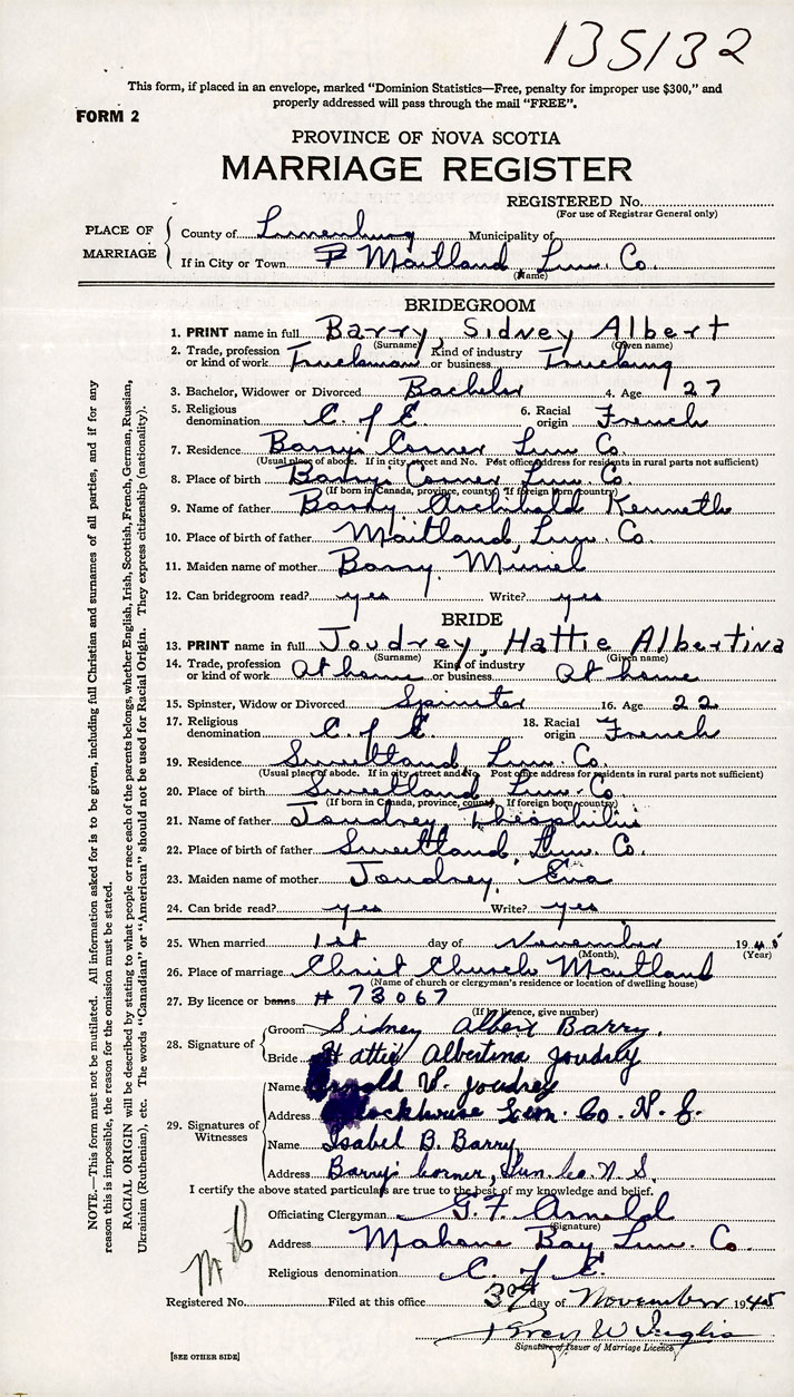 PLACE OF MARRIAGE County of Lunenburg in City or Town Maitland