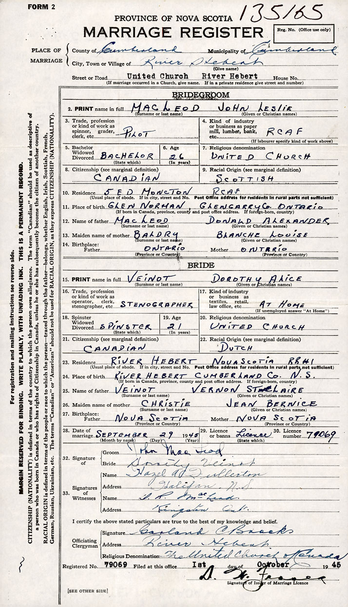26. Place of marriage United Church of Canada River Hebert, Cumberland County