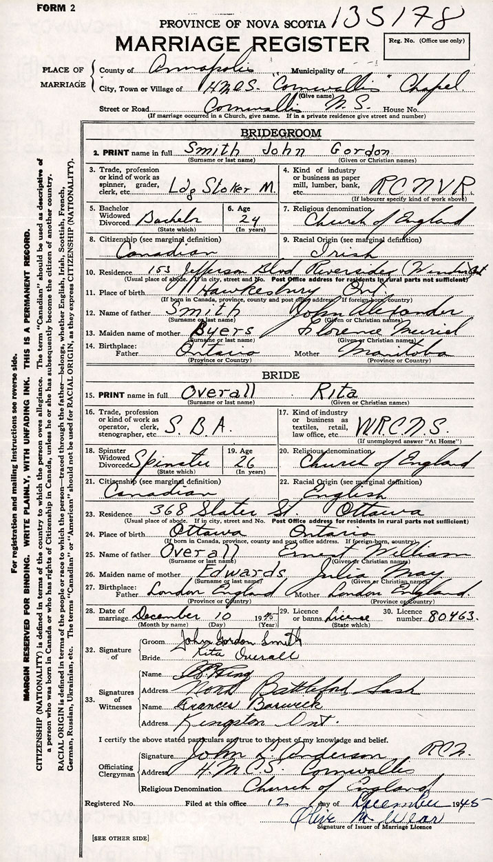 26. Place of marriage HMCS Cornwallis Chapel Cornwallis, Annapolis County