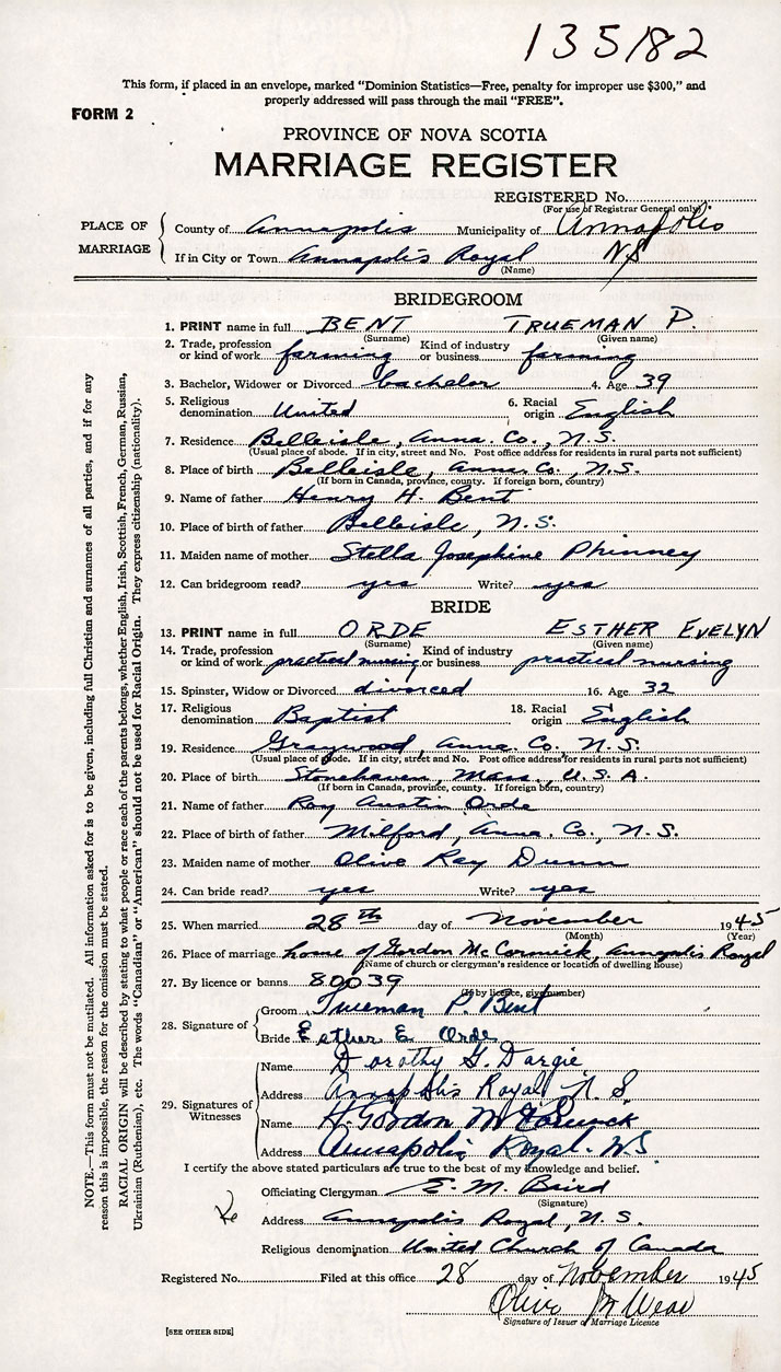 26. Place of marriage Home of Gordon McCormick Annapolis Royal, Annapolis County