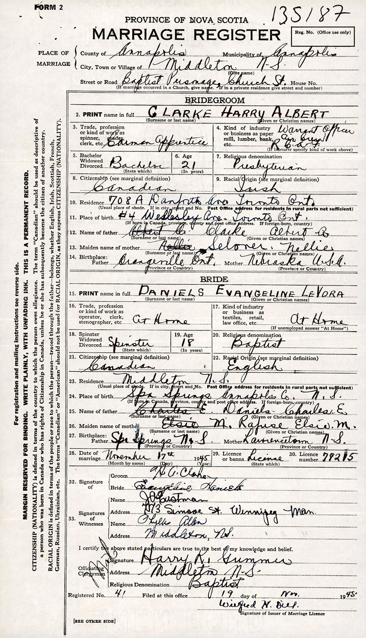 According to a certified copy of the Decree Absolute for Divorce dated 1952-10-13 and filed in the Office of the Registrar General under Divorce number 72, it is ordered that the marriage of Harry Albert Clarke and Evangeline Levora Daniels (Registered under marriage number 1945-135187) be null and void.