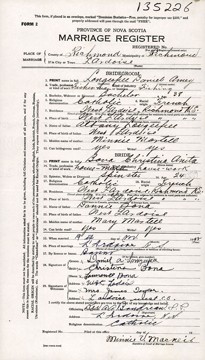 PLACE OF MARRIAGE County of Richmond in City or Town L'Ardoise