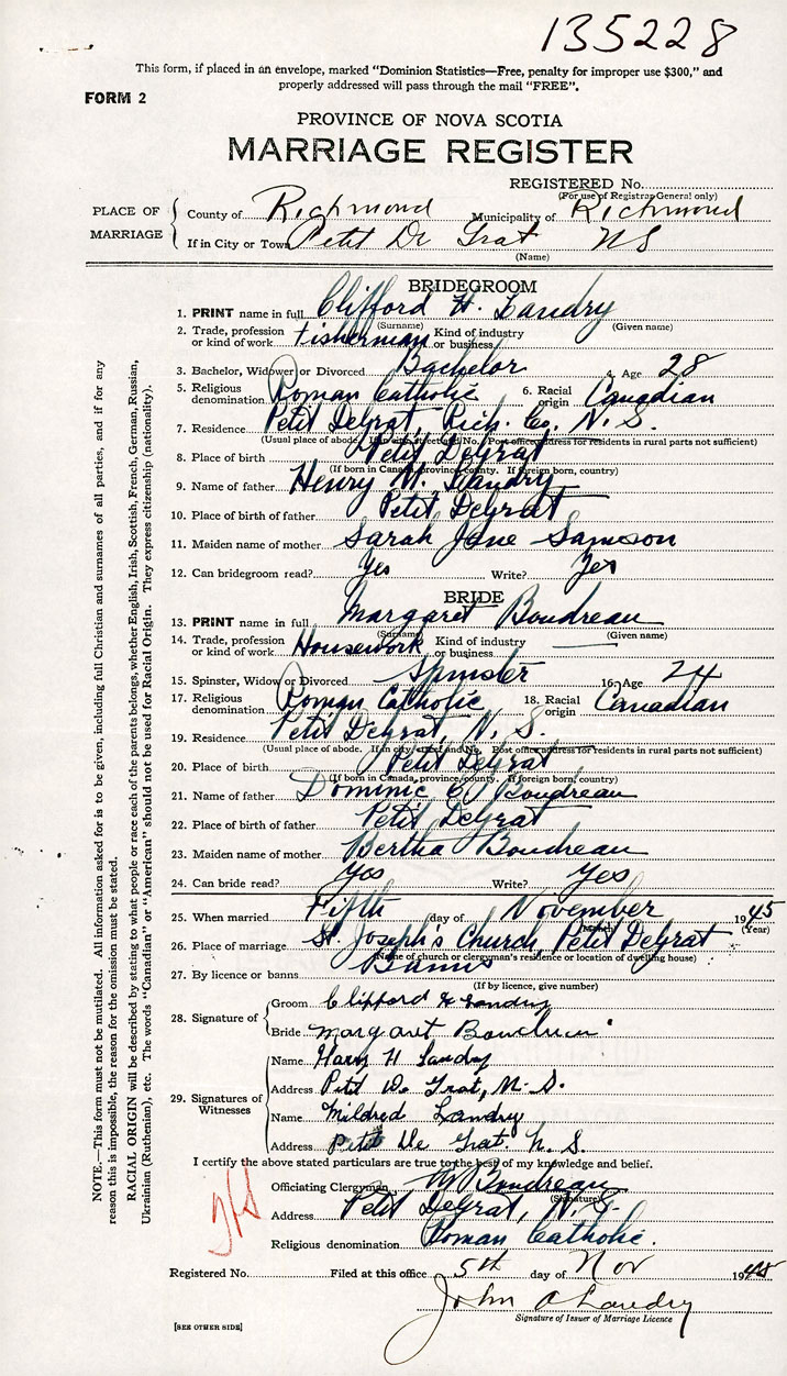 26. Place of marriage St. Joseph's Church Petit De Grat, Richmond County
