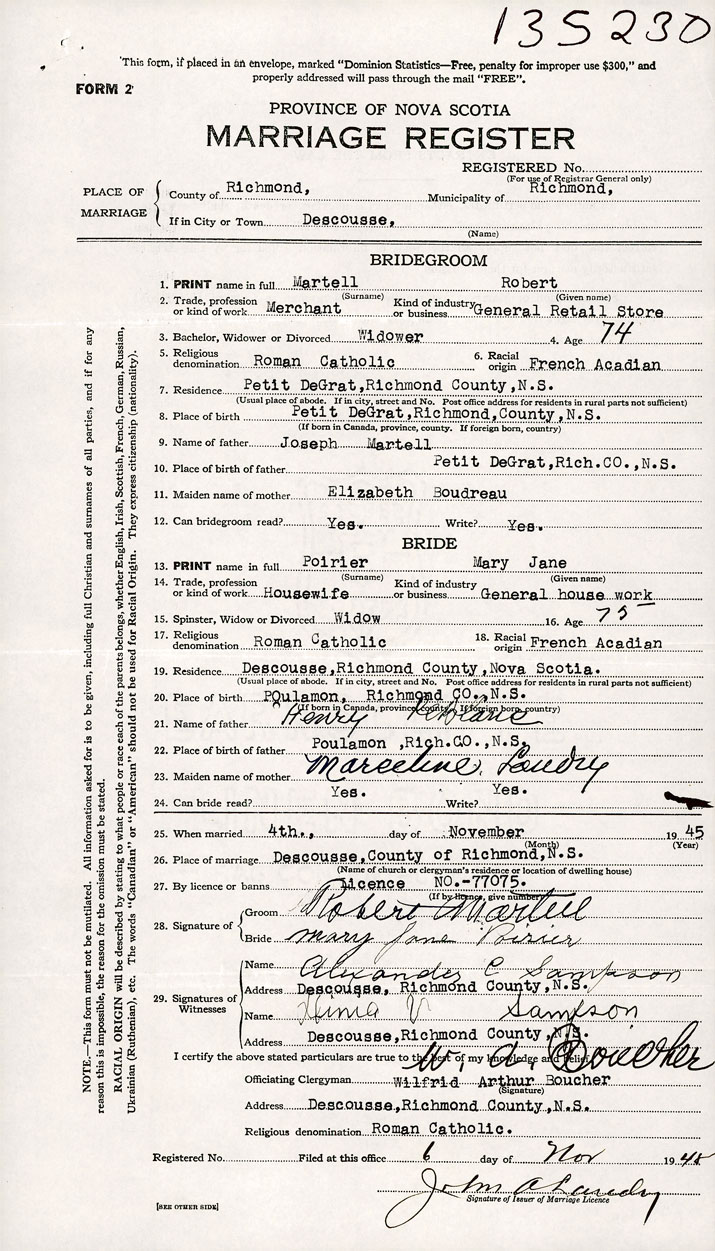 20. Place of birth Poulamon, Richmond County, Nova Scotia