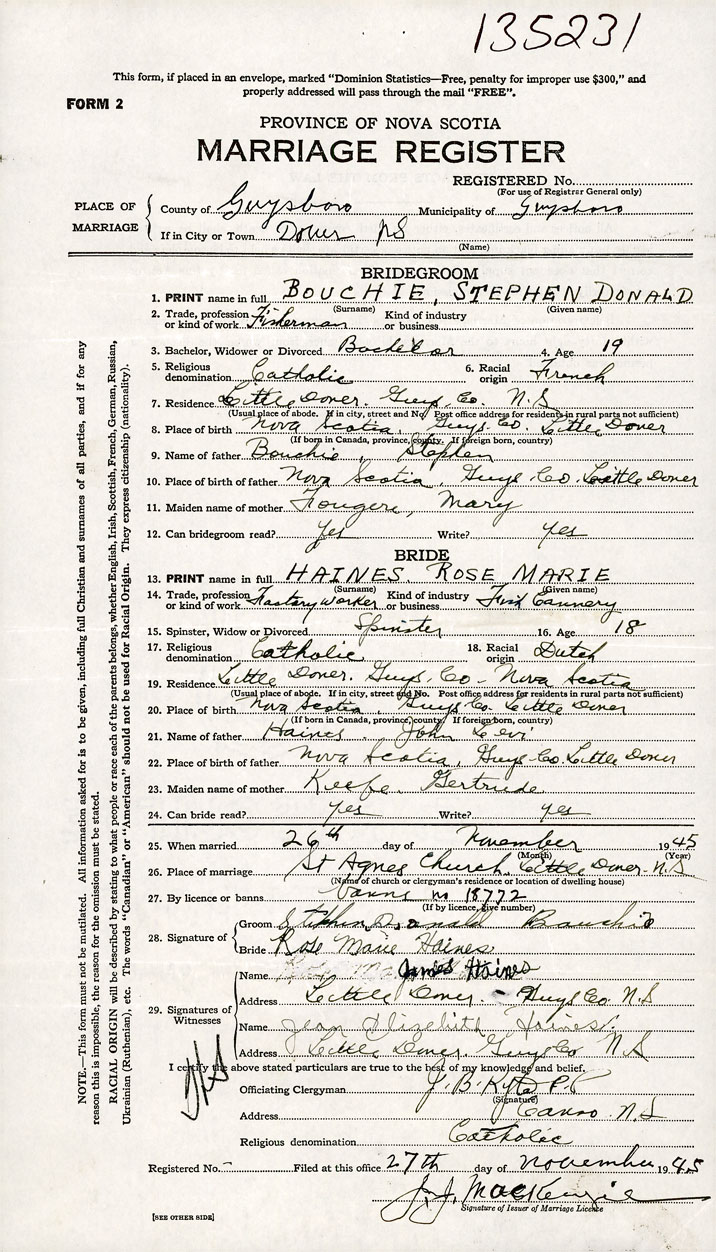 PLACE OF MARRIAGE County of Guysborough in City or Town Little Dover