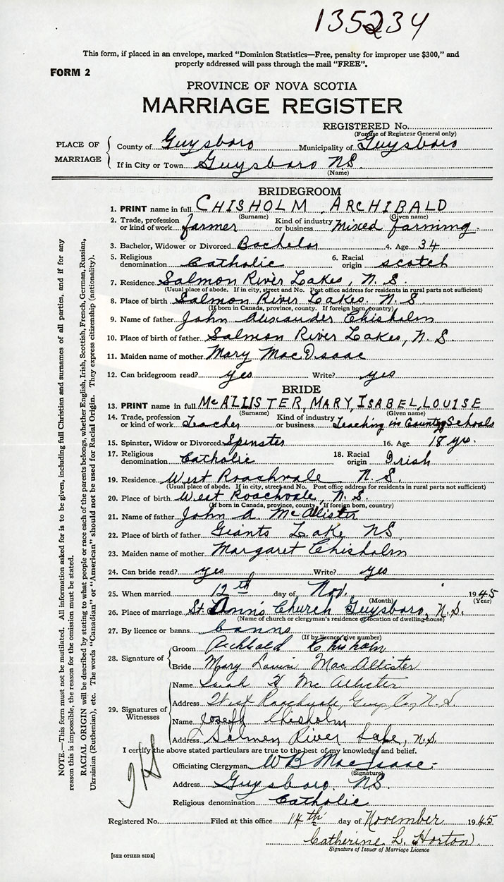 PLACE OF MARRIAGE County of Guysborough in City or Town Guysboro
