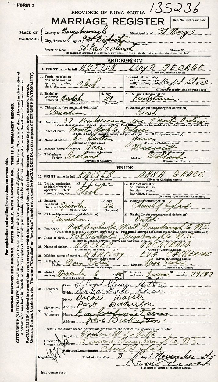 PLACE OF MARRIAGE County of Guysborough in City or Town Port Bickerton