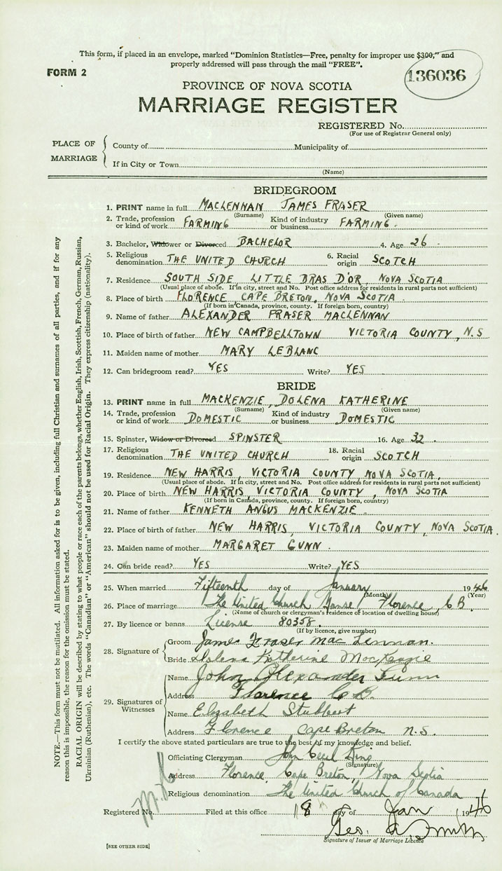 26. Place of marriage The United Church Manse, Florence Florence, Cape Breton County