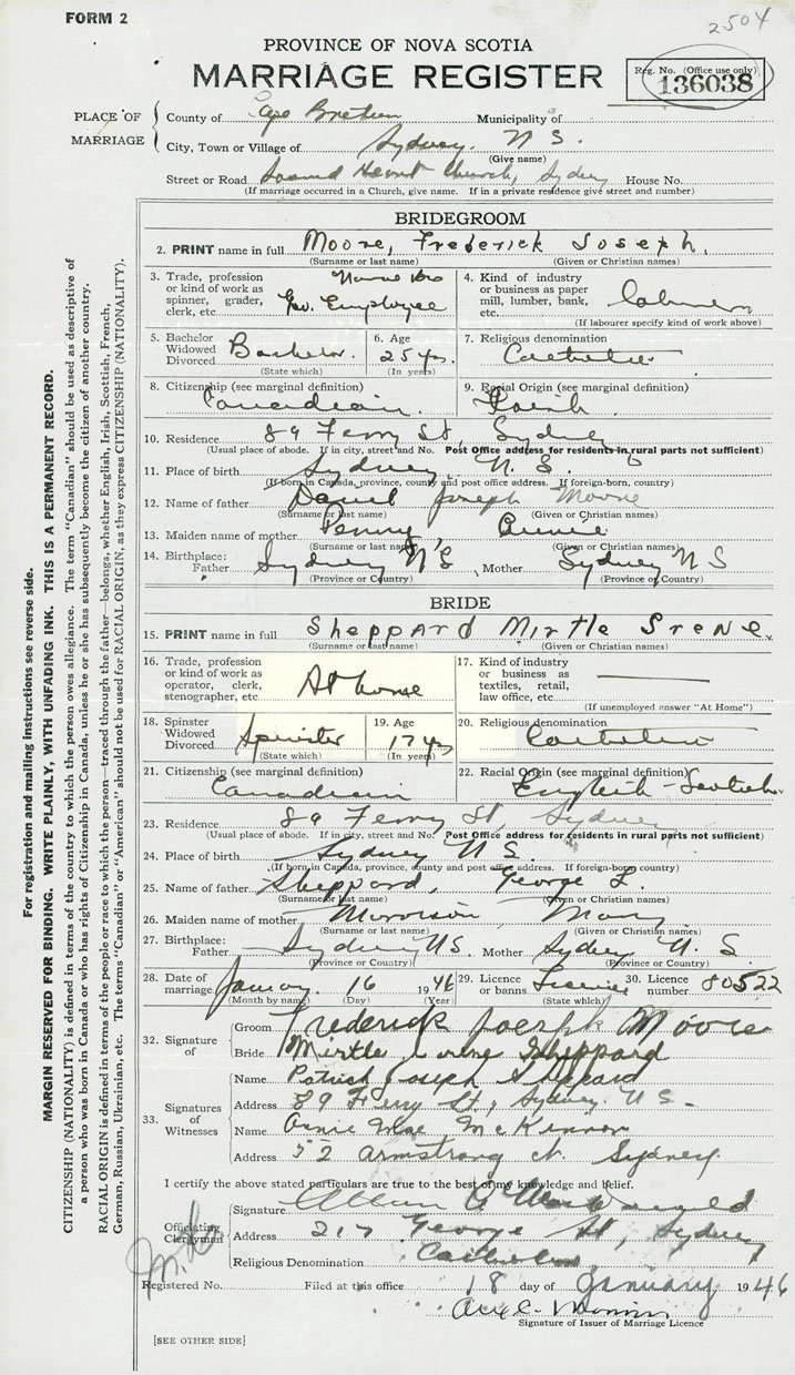28. Date of marriage January 16 1946 29. By license or banns License 30. License number 80522