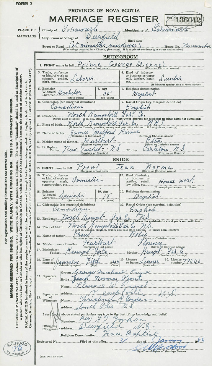 28. Date of marriage January 5 1946 29. By license or banns License 30. License number 79046