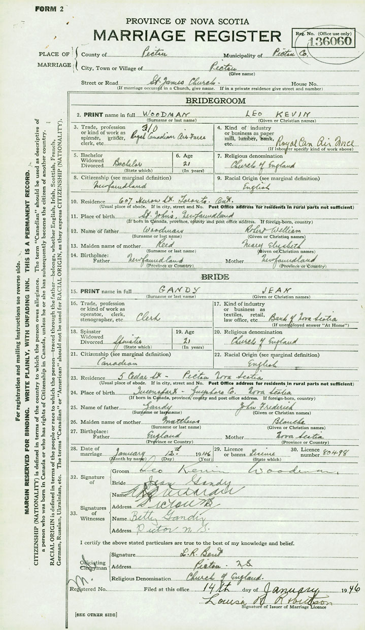 28. Date of marriage January 12 1946 29. By license or banns License 30. License number 80498