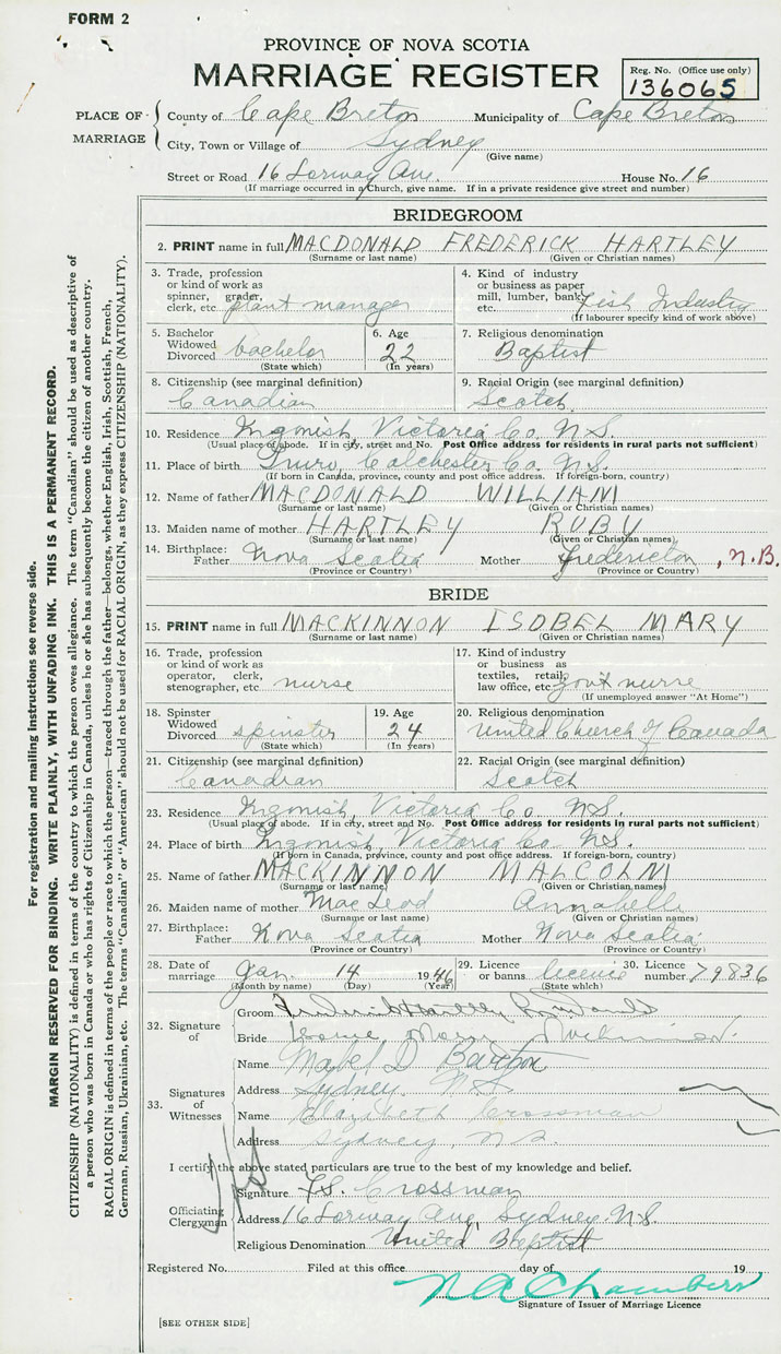 28. Date of marriage January 14 1946 29. By license or banns License 30. License number 79836