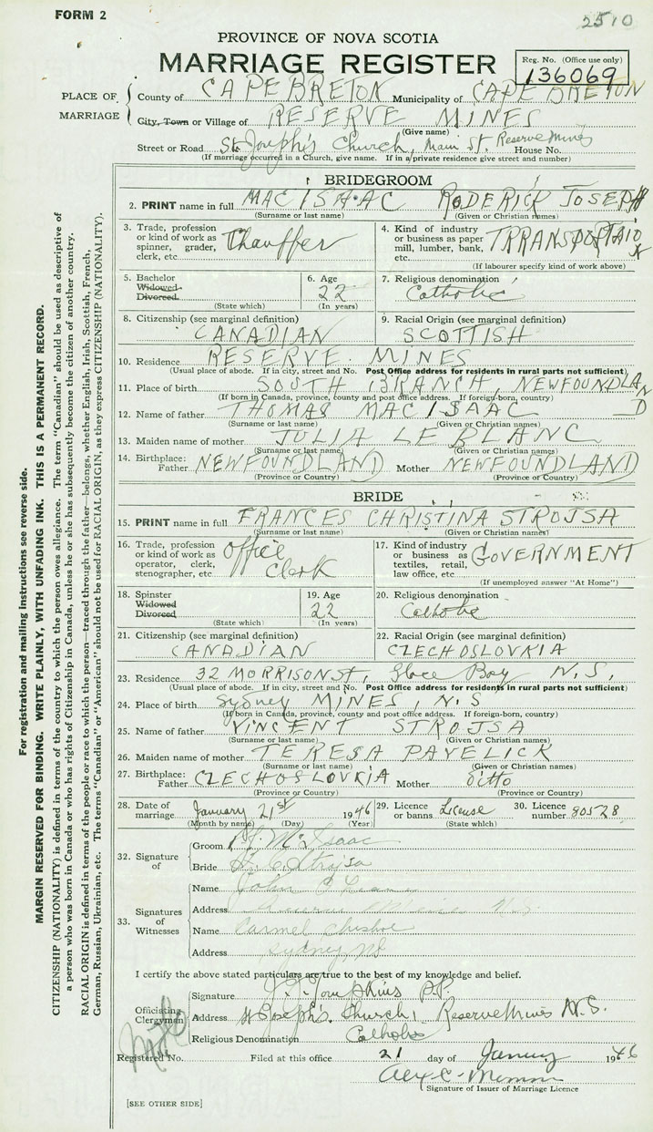 28. Date of marriage January 21 1946 29. By license or banns License 30. License number 80528
