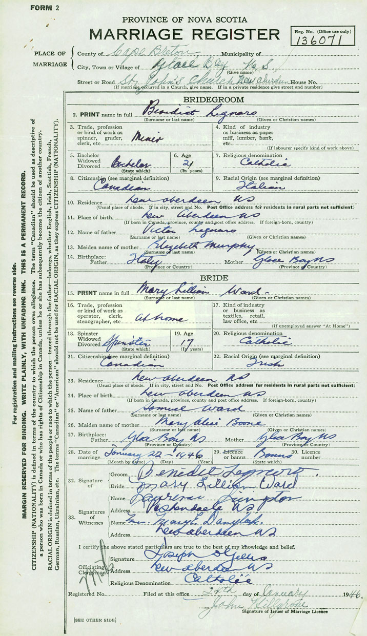 28. Date of marriage January 22 1946 29. By license or banns License 30. License number