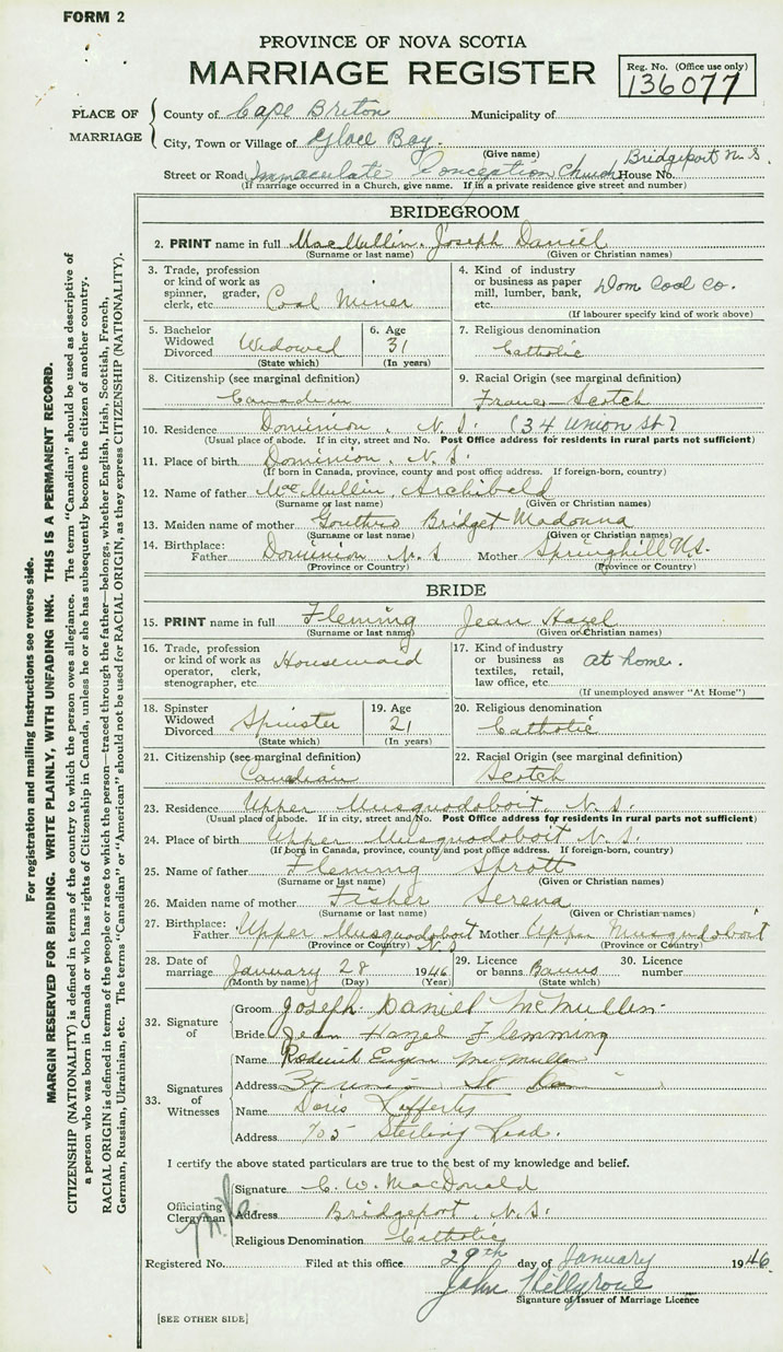 28. Date of marriage January 28 1946 29. By license or banns License 30. License number
