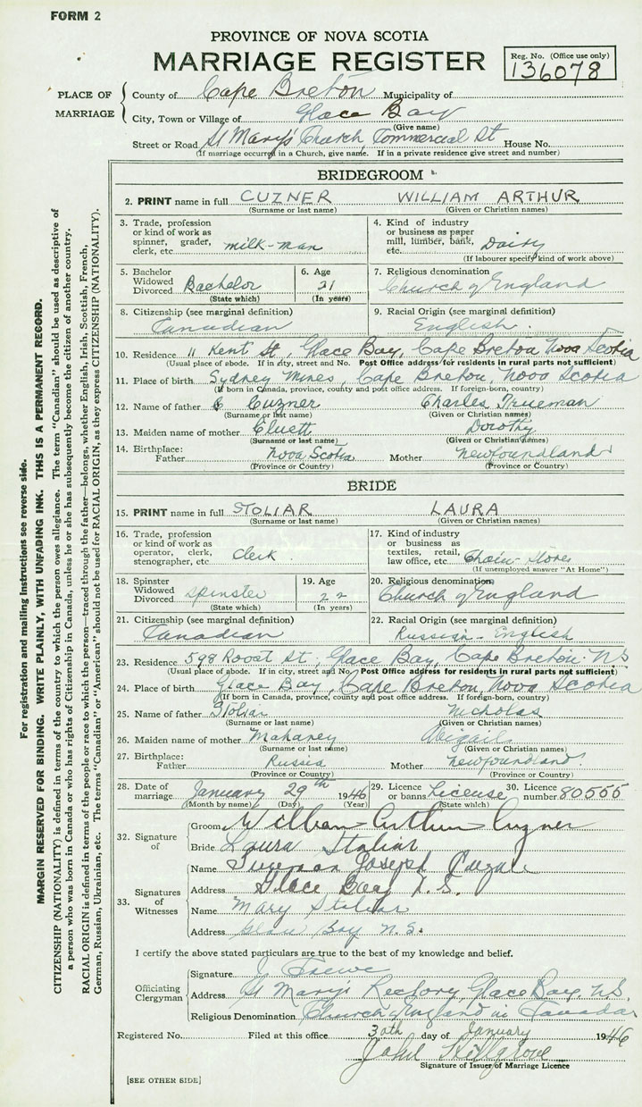 28. Date of marriage January 29 1946 29. By license or banns License 30. License number 80555