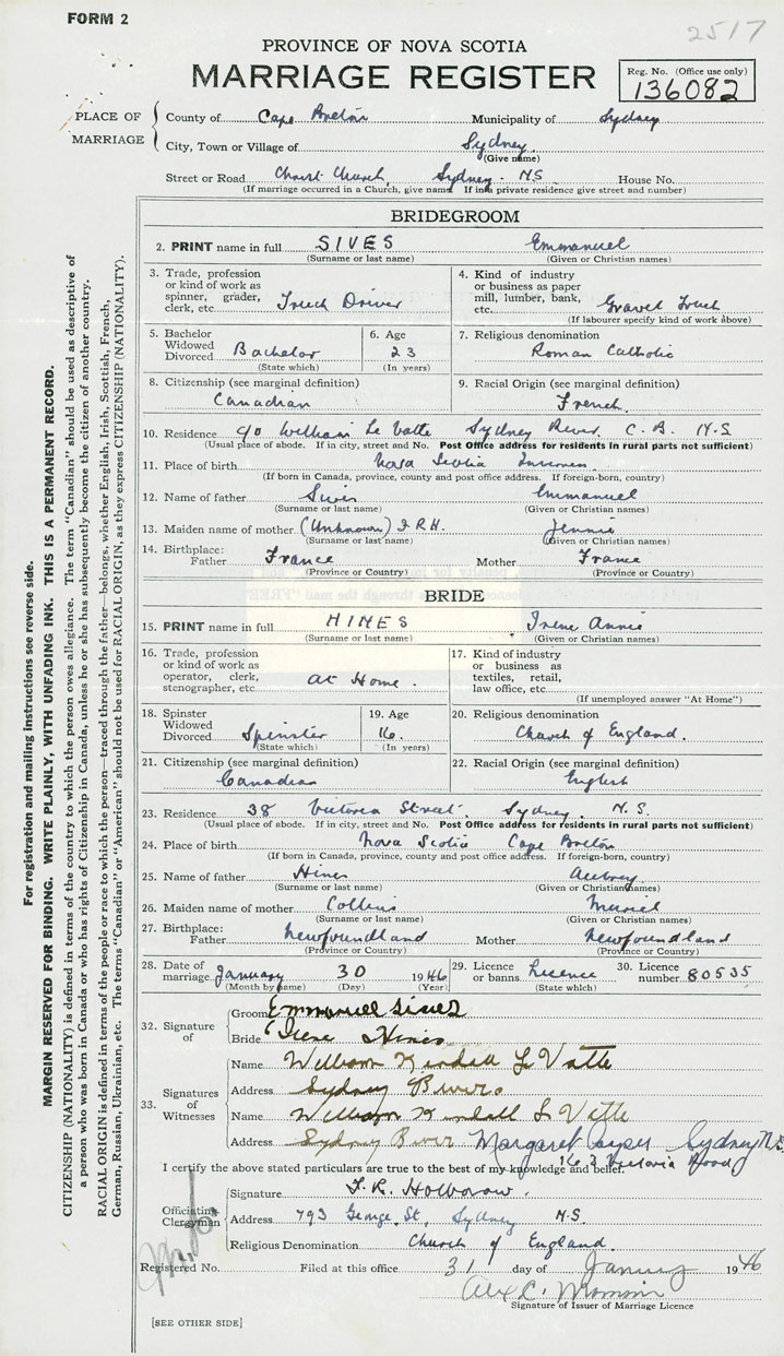 28. Date of marriage January 30 1946 29. By license or banns License 30. License number 80535