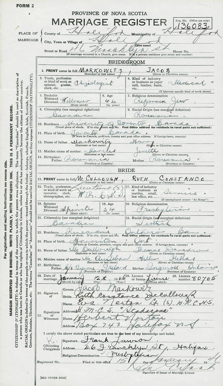 28. Date of marriage January 12 1946 29. By license or banns License 30. License number 80705