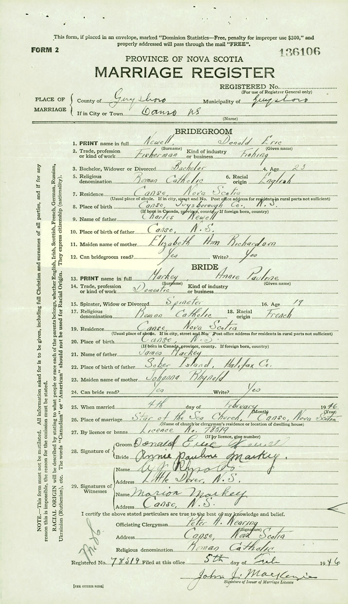 26. Place of marriage Star of the Sea Church Canso, Guysborough County