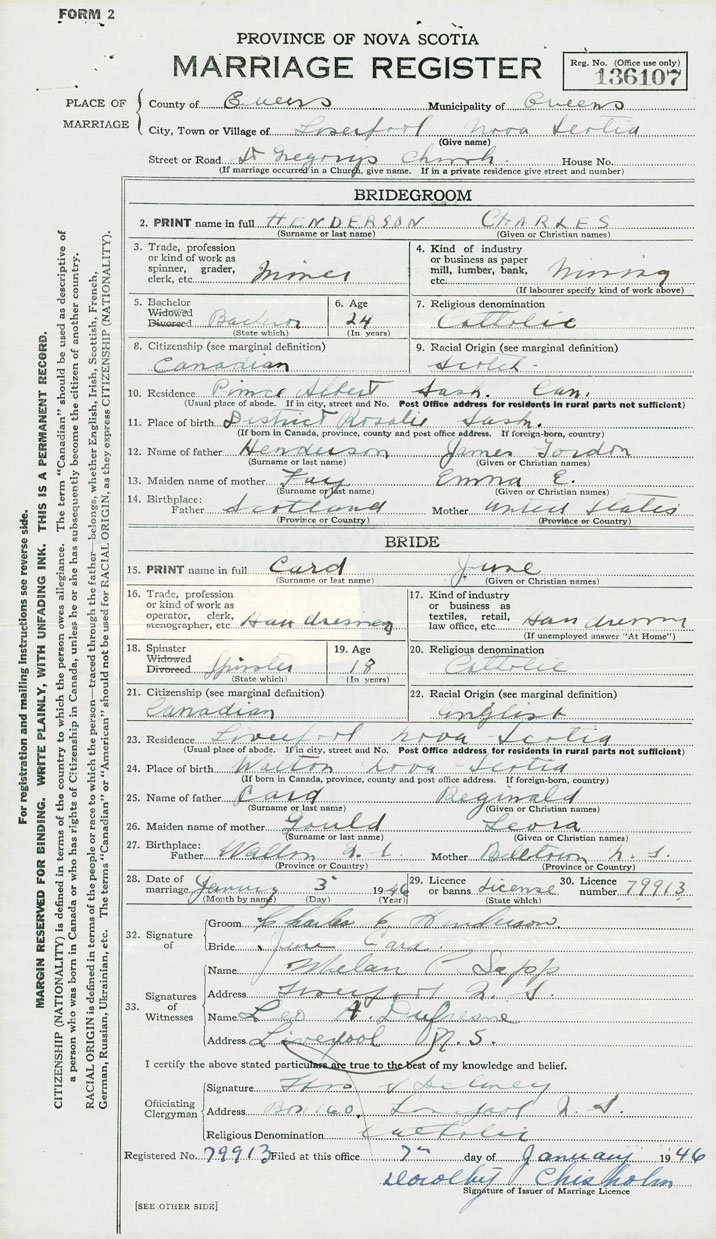 28. Date of marriage January 3 1946 29. By license or banns License 30. License number 79913