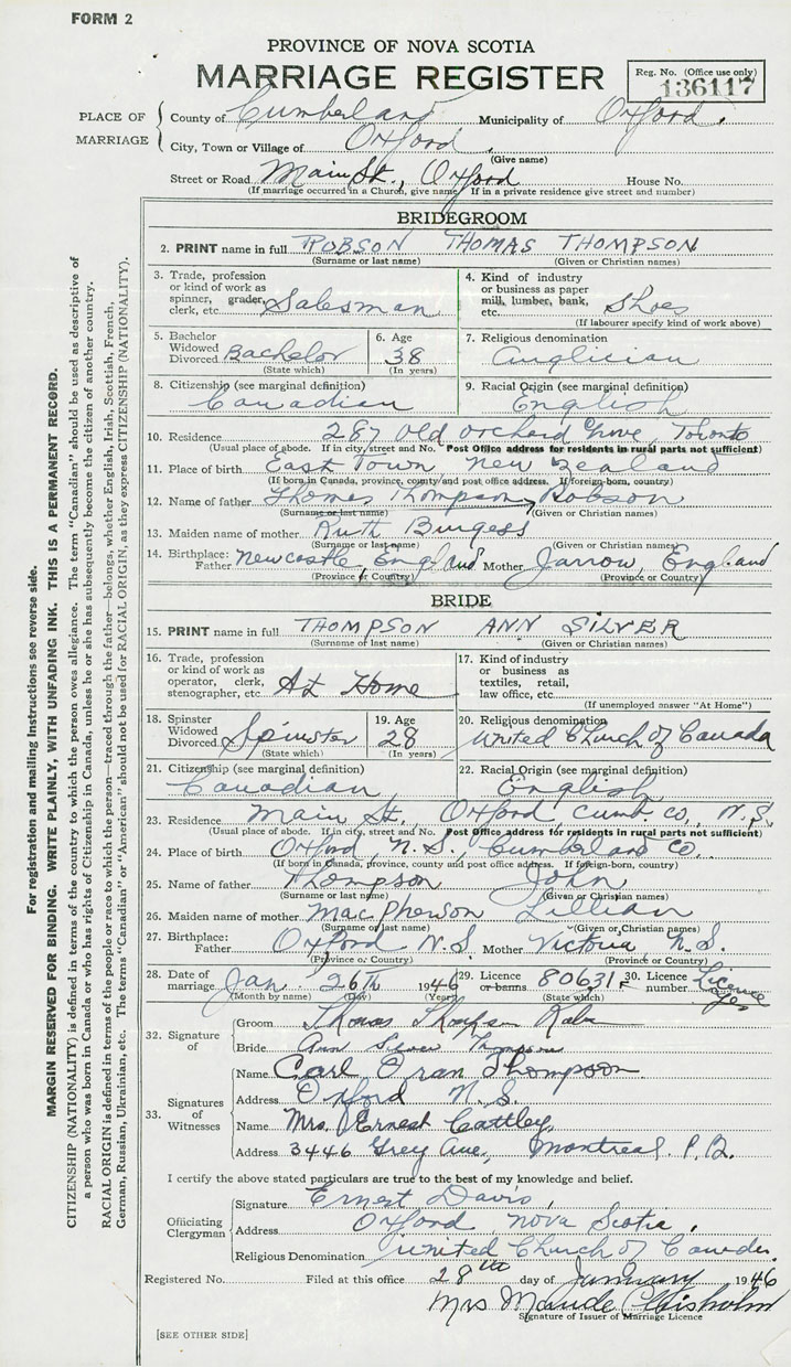 28. Date of marriage January 26 1946 29. By license or banns License 30. License number 80631