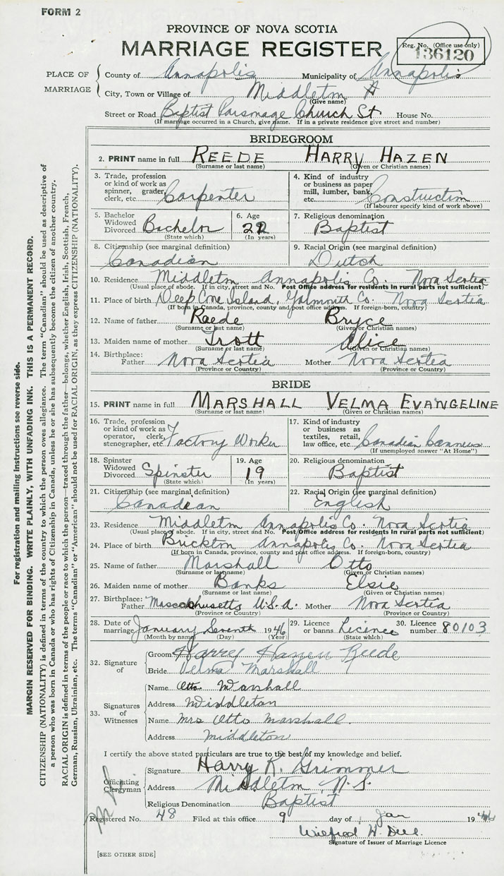28. Date of marriage January 7 1946 29. By license or banns License 30. License number 80103