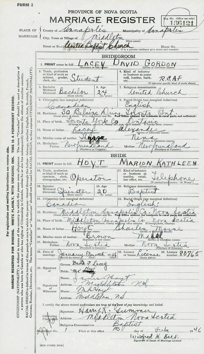 28. Date of marriage January 11 1946 29. By license or banns License 30. License number 80765