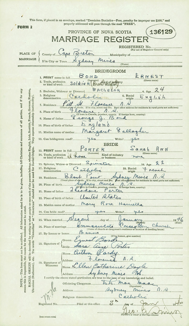 26. Place of marriage Immaculate Conception Church Sydney Mines, Cape Breton County
