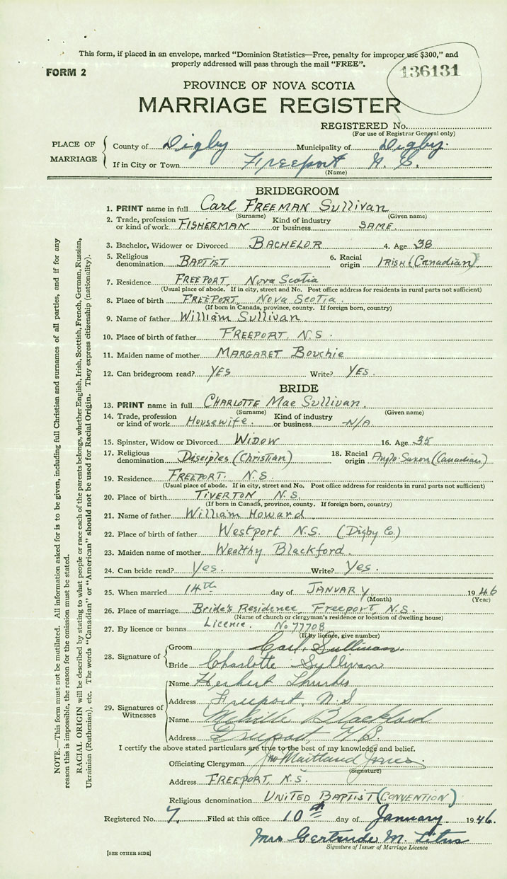 PLACE OF MARRIAGE County of Digby in City or Town Freeport