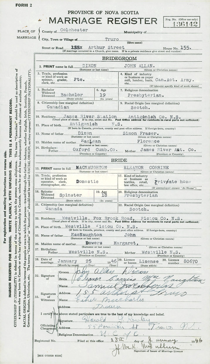28. Date of marriage January 25 1946 29. By license or banns License 30. License number 80670