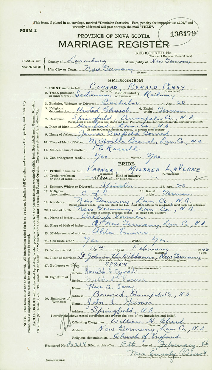 PLACE OF MARRIAGE County of Lunenburg in City or Town New Germany