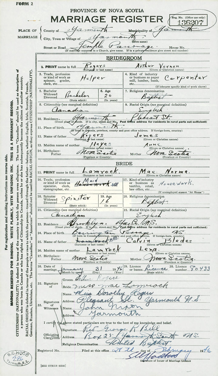 28. Date of marriage January 31 1946 29. By license or banns License 30. License number 80433