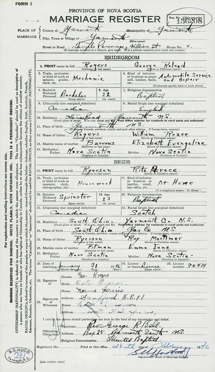 28. Date of marriage January 31 1946 29. By license or banns License 30. License number 80434