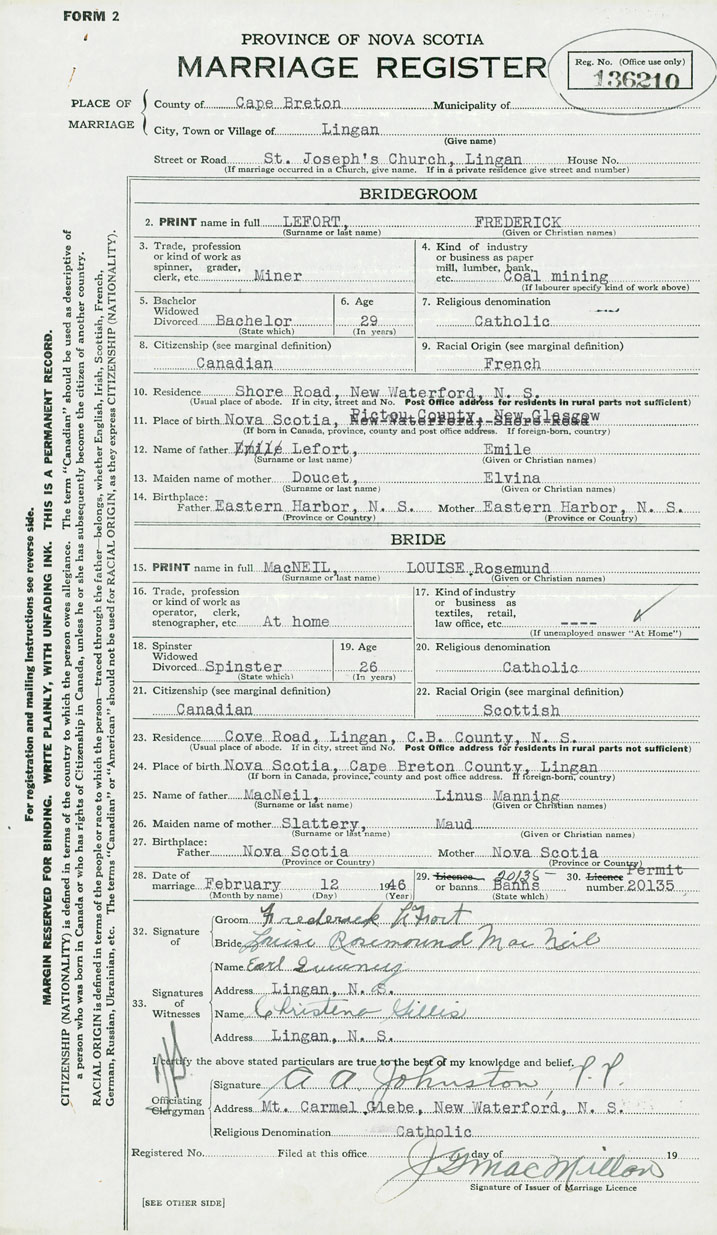 28. Date of marriage February 12 1946 29. By license or banns License 30. License number 20135