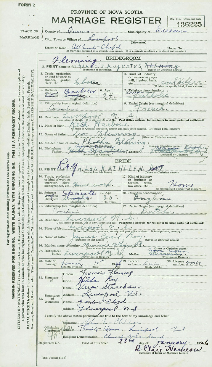 28. Date of marriage January 12 1946 29. By license or banns License 30. License number 80089