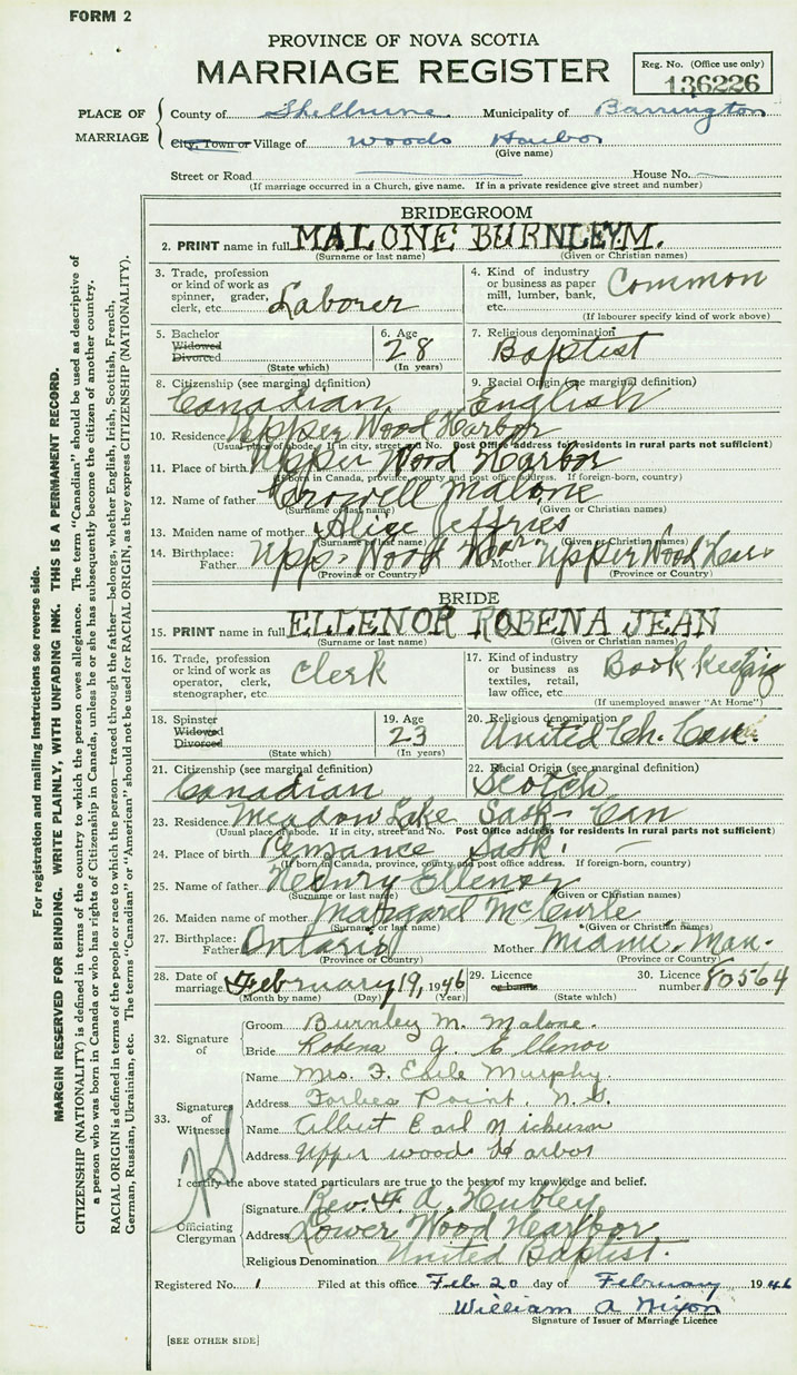 28. Date of marriage February 19 1946 29. By license or banns License 30. License number 80564