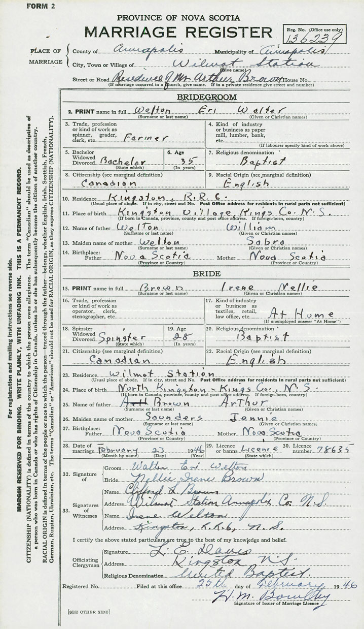 28. Date of marriage February 23 1946 29. By license or banns License 30. License number 78635