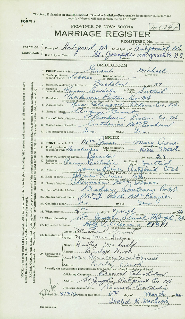 26. Place of marriage St. Josephs Church Antigonish, Antigonish County