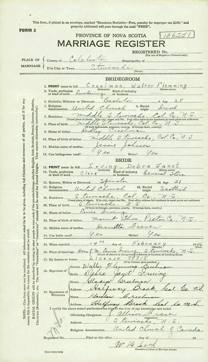 PLACE OF MARRIAGE County of Colchester in City or Town Stewiacke